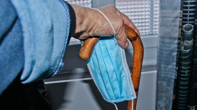 Personne agee tenant une canne en bois avec un masque a sa main contre la covid -19 Ehpad en Sarthe Pays de la Loire France 12 Decembre 2020//07GILEMICHEL_1.1304/2012121649/Credit:GILE Michel/SIPA/2012121702