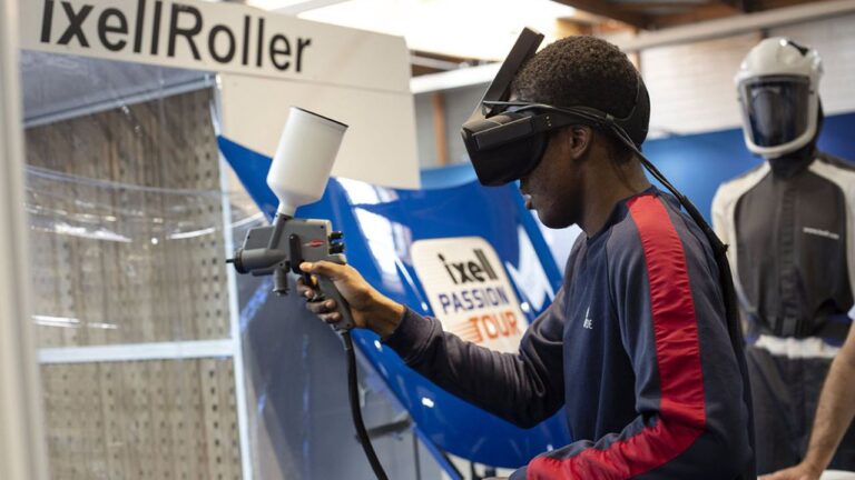 Jeune de la formation EPIDE, Stand Renault, formateur guide un jeune, atelier peinture a pistolet avec lunettes de realite virtuelle. salon orientation, formation, emploi des jeunes de 16 a 25 ans